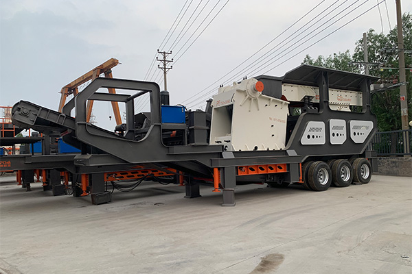 移動式破碎站多機聯(lián)合作業(yè)(振動給料機+顎式破碎機+輸送機、反擊式破碎機+振動篩+輸送機):物料落入振動給料機,簡單的篩分后被均勻連續(xù)的喂入顎式破碎機中,粗碎完成的物料再由輸送機運到反擊式破碎機進行細碎處理,一部分滿足粒度要求的成品經(jīng)振動篩區(qū)分規(guī)格后,被輸送機運到不同的料堆,另一部分不滿足粒度要求的成品返回反擊式破碎機再次處理。